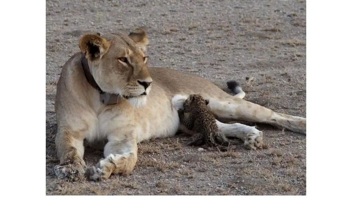این توله پلنگ دقیقا هم سن توله‌های این ماده شیر است که دو هفته پیش به دنیا امده‌اند.