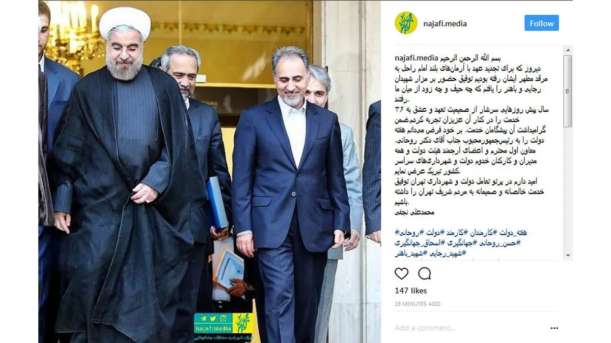 ۳۶ سال پیش روزهایی سرشار از صمیمیت تعهد و عشق به خدمت را در کنار آن عزیزان تجربه کردم.ضمن گرامیداشت آن پیشگامان خدمت٬ بر خود فرض می‌دانم هفته دولت را به رئیس‌جمهور‌محبوب جناب آقای دکتر روحانی، معاون اول محترم و اعضای ارجمند هیئت دولت و همه مدیران و کارکنان خدوم دولت و شهرداری‌های سراسر کشور تبریک عرض نمایم.