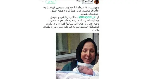 فرید الدین حداد عادل با انتشار پستی در صفحه توئیتر خود از تولد نوه جدید رهبر انقلاب خبر داد.