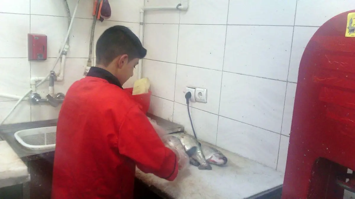 یوسف افزود:من چهار ماه قبل به مشهد آمدم. ترک تحصیل کردم. وضعیت درسی ام نه خوب بود و نه بد،حتی یک آب شسته تر از بقیه بودم. اما ناچار بودم درسم را ول کنم. اصلا هم ناراحت نیستم. به قول پدرم مرد باید کار کند وبرای رزق روزی حلال از جان مایه بگذارد.از طریق علی آقا (پسر جوانی که همکار او در فروشگاه است ) با این فروشگاه آشنا شدم. مسؤلیت من ریز و تکه و تمیز کردن ماهی و مرغ برای مشتری ها است. از کار خسته نمی شوم. فقط شب آخر سال خیلی سخت بود. ساعت ۱۱شب از فروشگاه تعطیل شدیم. بعد هم وقت آرایشگاه گرفته بودم. ساعت ۲شب بود که به محل کار پدرم رسیدم. ما شب ها آنجا می خوابیم.