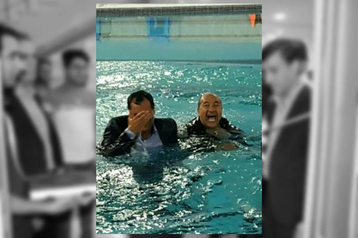 عکس / نماینده و فرماندار با کت و شلوار داخل استخر پریدند! / در مراسم افتتاح استخر شهرستان فراشبند