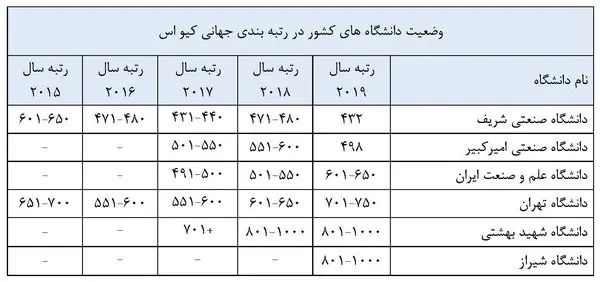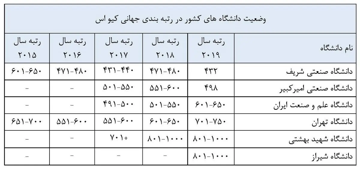 وی افزود: صنعتی شریف با رتبه ۴۳۲، دانشگاه صنعتی امیرکبیر با رتبه ۴۹۸، دانشگاه علم و صنعت ایران با رتبه ۶۵۰-۶۰۱، دانشگاه تهران با رتبه ۷۵۰-۷۰۱ و دانشگاه‌های شهید بهشتی و دانشگاه شیراز با رتبه ۱۰۰۰-۸۰۱ هستند.