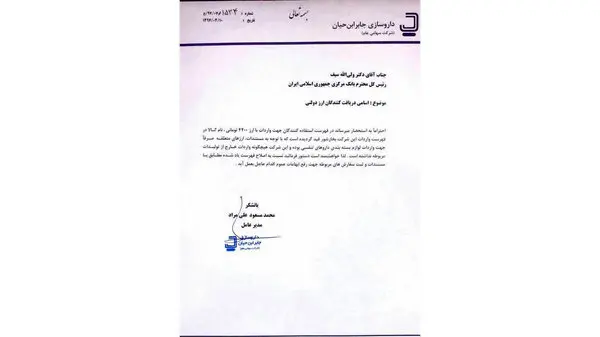نامه مدیر عامل شرکت داروسازی جابر ابن حیان به رییس کل بانک مرکزی+سند