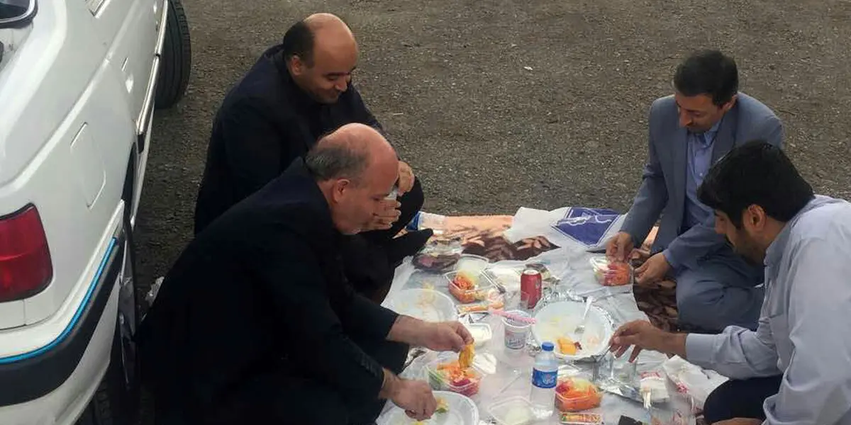 رکنا: تصویری از سید پرویز فتاح، رییس کمیته امداد امام خمینی(ره) و تعدادی دیگر از همراهان را در حال خوردن ناهار در کنار جاده مشاهده میکنید.
