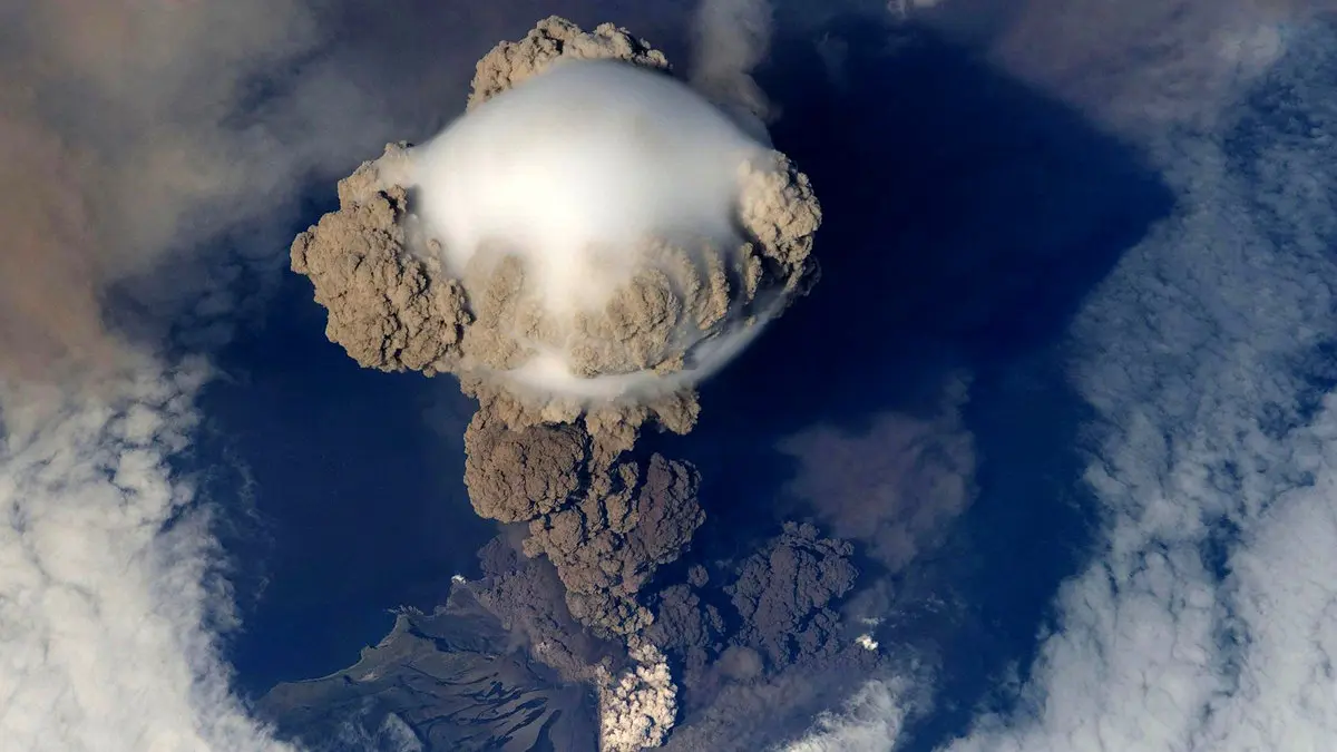 رکنا: تصویری از فوران آتشفشان ساریچف در جزایر کوریل روسیه را مشاهده می کنید که محققان توانسته اند از فضا آن را به ثبت برسانند.
