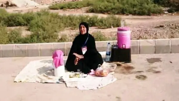 این بانوی 80 ساله که اهل روستای سرحانیه خرمشهر است، همسرش را از دست داده و 2 پسر و چهار دختر دارد، اما اندوخته و پس انداز یکسال خود را وقف زائران امام حسین(ع) کرده و هر روز صبح با زیراندازی کوچک، فلاسک چای و یک ظرف خرما، کوچکترین موکب را در مسیر زائران اربعین حسینی در مرز شلمچه برپا می کند.