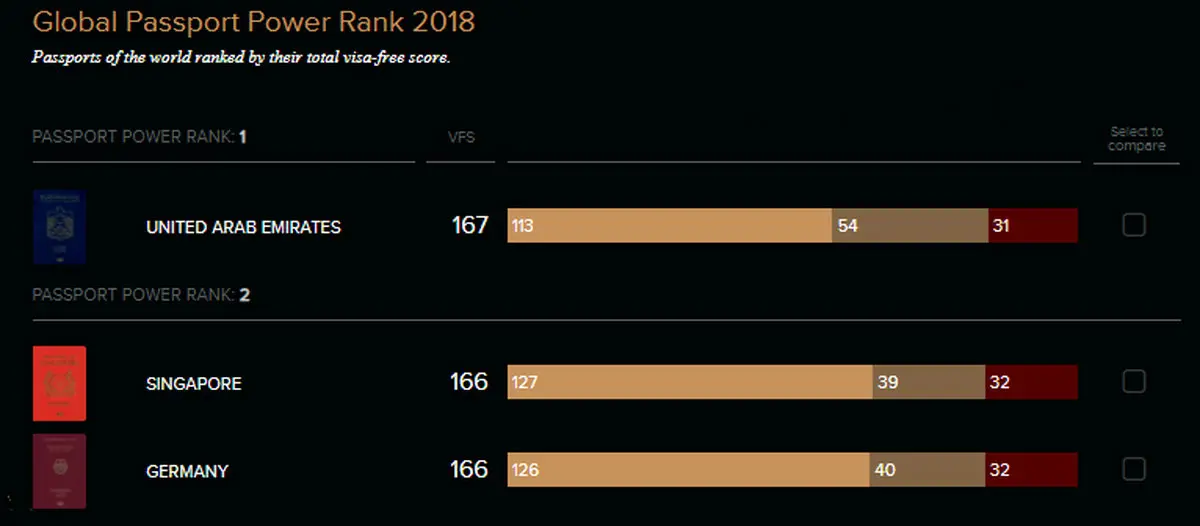 در حال حاضر با گذرنامه کشور امارات میتوان بدون ویزا به ۱۱۳ کشور جهان سفر کرد. پیش از این رتبه نخست پرقدرتترین گذرنامه جهان در اختیار کشور سنگاپور بود.
