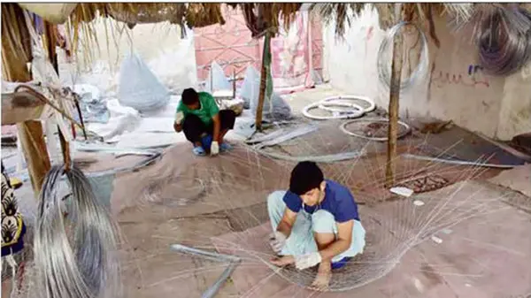 کارگاه پر از صدای خش خش برخورد سیم‌هاست. نور آفتاب از لابه‌لای برگ‌های خرما که نقش سقف را بازی می‌کنند روی دست و صورت کارگران افغان که هرکدام روی سکوی کوچکی نشسته‌اند، می‌افتد. ارتفاعی سی سانتیمتری برای کم شدن خطر برخورد سیم با دست‌‌ها و چشم‌ها‌. تنها جمله‌ای که از کارگران می‌شنوم تذکر برای نزدیک نشدن به محدوده سیم‌هایی است که در هوا می‌رقصند.