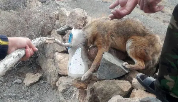 در عکس دیده می شود که سر یک شغال داخل ظرفی پلاستیکی گیر کرده و 2 مرد در حال نجات او هستند.