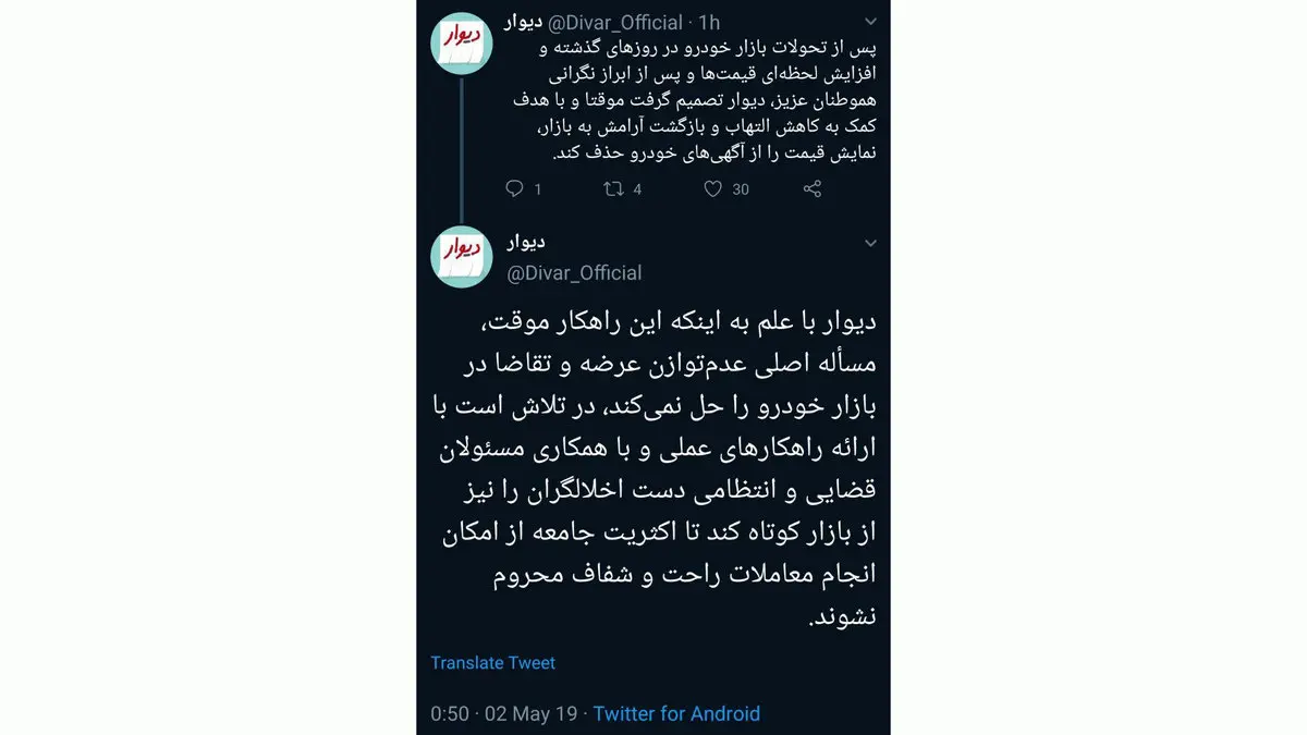 توییت سایت دیوار در‌مورد حذف نمایش قیمت آگهی‌ها