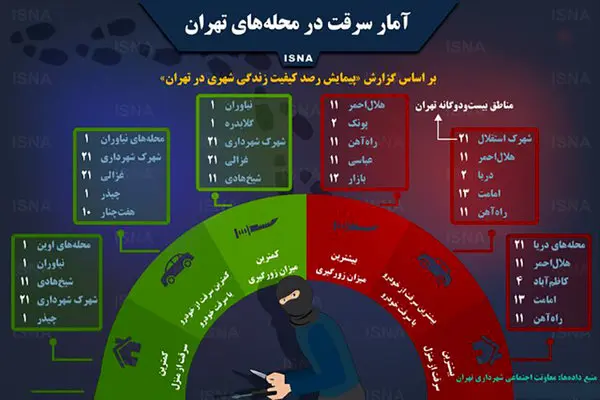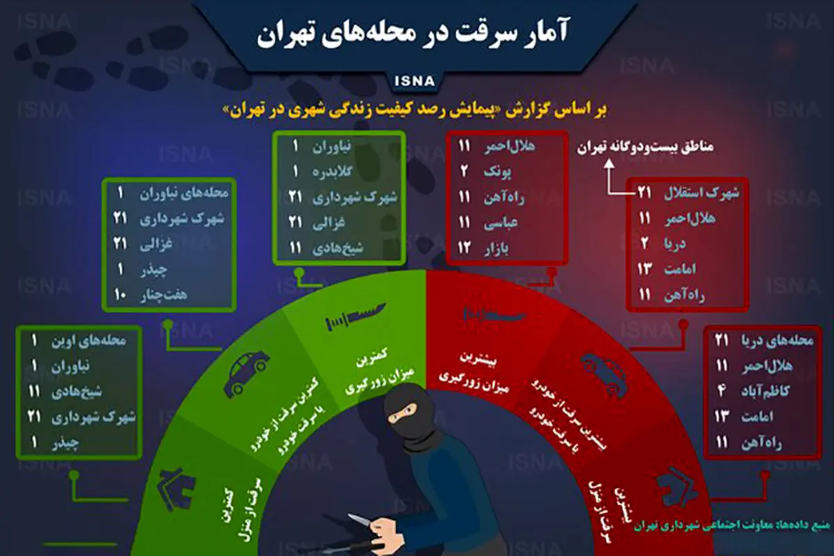 حوادث رکنا : اینفوگرافی که مشاهده می کنید آمار سرقت را در محله های مختلف تهران نشان می دهد.