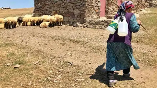 مرد در حال دوشیدن گوسفند است. 300 رأس دام دارد. می‌گوید اینجا دیگر آب و علف ندارد. خودم و چوپانم اینجا هستم و خانواده‌ام خیلی کم می‌آیند و می‌مانند. امکانات نیست برای همین زن و بچه اینجا نمی‌ماند. اگر کسی‌ مریض شود باید زنگ بزنیم آب بر ماشین بفرستند.