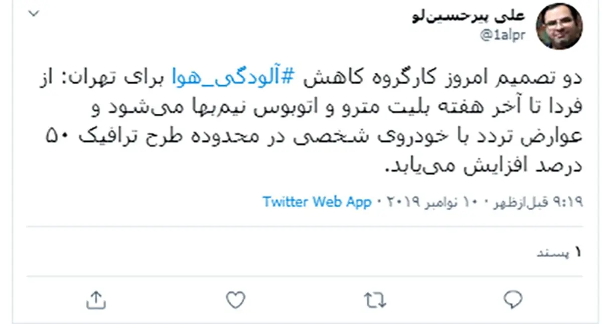 علی پیر حسین لو، مشاور معاونت حمل و نقل و ترافیک شهرداری تهران در فضای مجازی درباره تمهیدات ترافیکی برای کاهش آلودگی هوا چنین پستی را منتشر کرد: