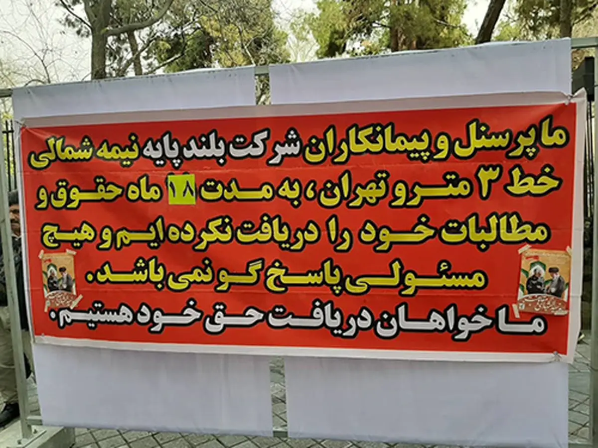 آنها که نسبت به عدم پرداخت ۱۸ ماهه حقوق خود از سوی متروی تهران اعتراض داشتند، گفتند: مدیران مترو به ما قول میدهند که حقوقتان را واریز می کنیم، در حالی که با وعدهو وعید ۱۸ ماه است که بدون حقوق مشغول به کاریم. ما ۶۰ نفر مشغول در دو کارگاه اقدسیه و نوبنیاد هستیم که ماههاست حقوق خود را دریافت نکردهایم. البته اعتبار به مترو میدهند، اما برای تجهیز و توسعه مترو استفاده میشود و حقوق کارگران پرداخت نمیشود.
