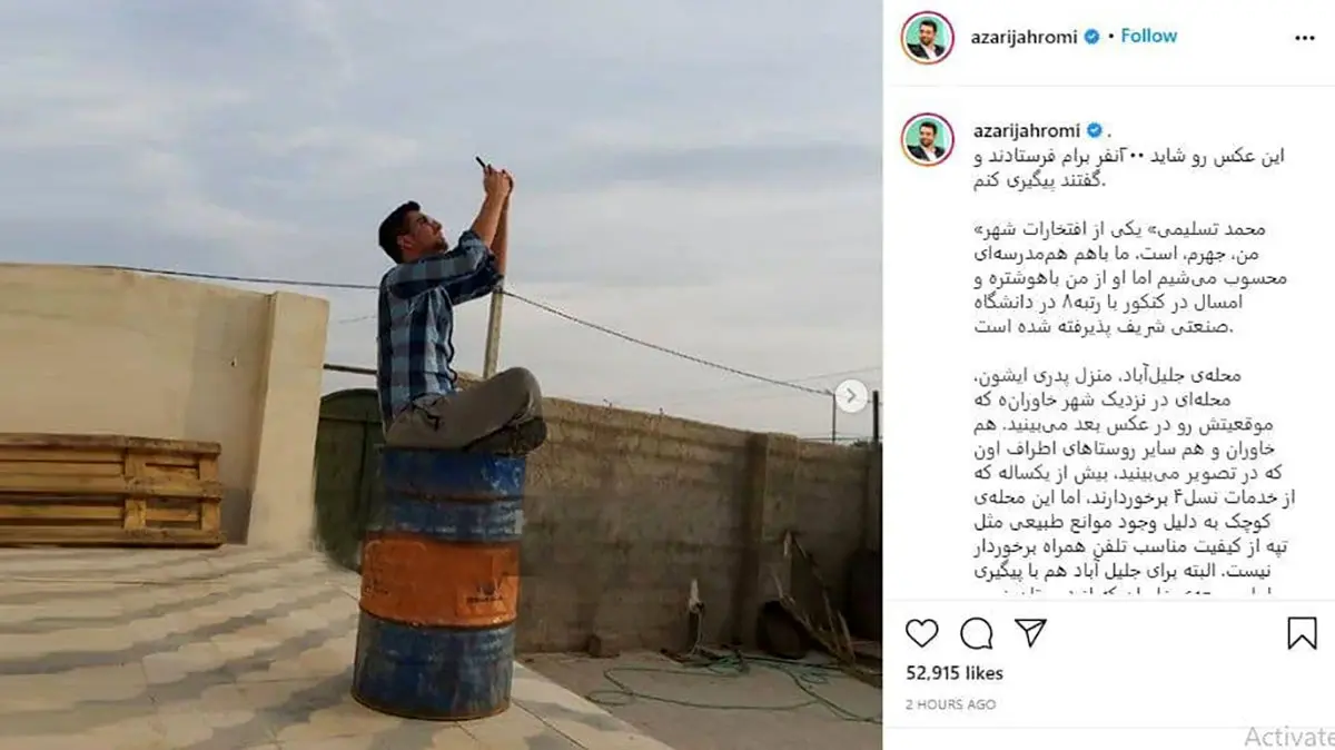 اینترنت / به گزارش رکنا، آذری جهرمی پس از توضیحاتی در مورد ساختار جغرافیایی منطقه و تشکر از محمد تسلیمی برای اطلاعرسانی نوشته است: از برخی دوستان همشهری شنیدم که گفتند آقای تسلیمی به همراه خانوادهشون به شهر جهرم نقل مکان کردند و در جهرم سکونت دارند و مشکلی برای آموزش آنلاین ندارند و بیشتر این عکس رو برای جلب توجه به پوشش دادن محلهی خودشون منتشر کردند"