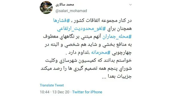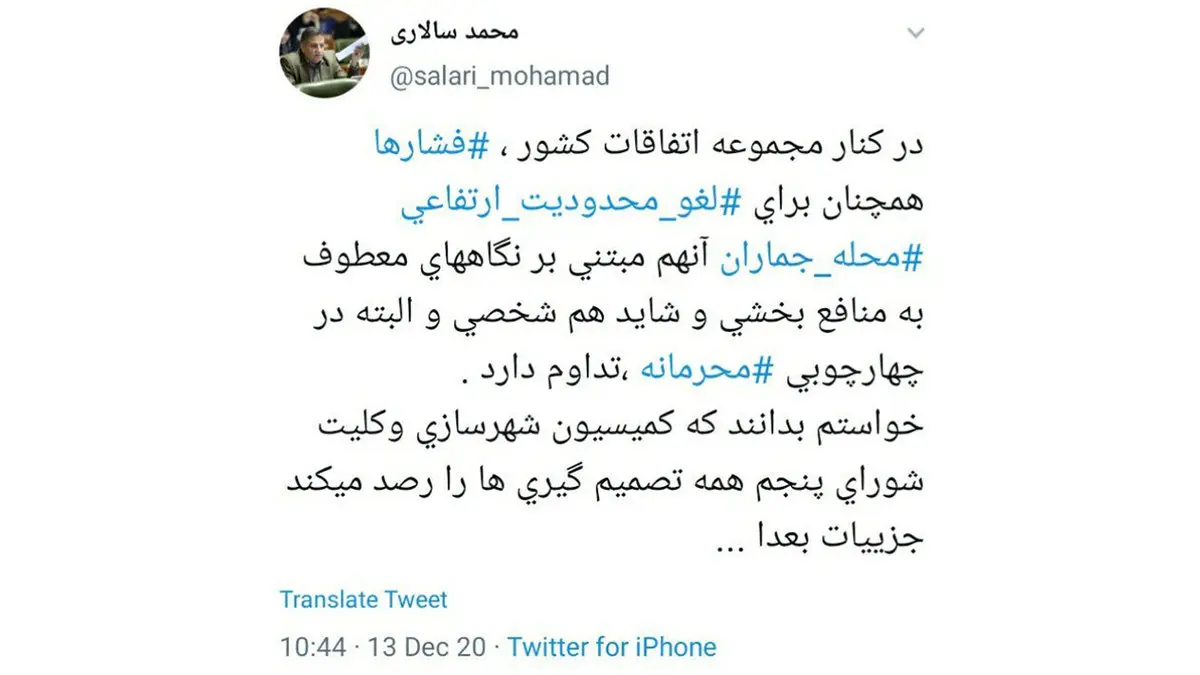 دبیرخانه شورای عالی معماری و شهرسازی موظف شده است تا مشاوری را برای بررسی طرح لغو محدودیت و ساخت و ساز تا چهار طبقه بالای همکف ( یعنی 5 طبقه) با سطح اشغال 60درصد به کار گیرد و طرح تفصیلی محله جماران که از سال 80 به تصویب رسیده را لغو کند. عبدالرضا گلپایگانی، معاون شهرسازی و معماری شهرداری تهران اما اعلام کرد که لغو محدودیت ارتفاعی جماران را اجرا نمیکنیم. این تنش تاکنون ادامه داشته و محمد سالاری در توئیتر خود نوشت: "در کنار مجموعه اتفاقات کشور، فشارها همچنان برای لغو محدودیت ارتفاعی محله جماران آنهم مبتنی بر نگاه های معطوف به منافع بخشی و شاید هم شخصی و البته در چهارچوبی محرمانه، تداوم دارد. خواستم بدانند که کمیسیون شهرسازی و کلیت شورای پنجم همه تصمیم گیری ها را رصد می کند. جزییات را بعدا اعلام می کنم." آخرین قیمت های بازار ایران را اینجا کلیک کنید.