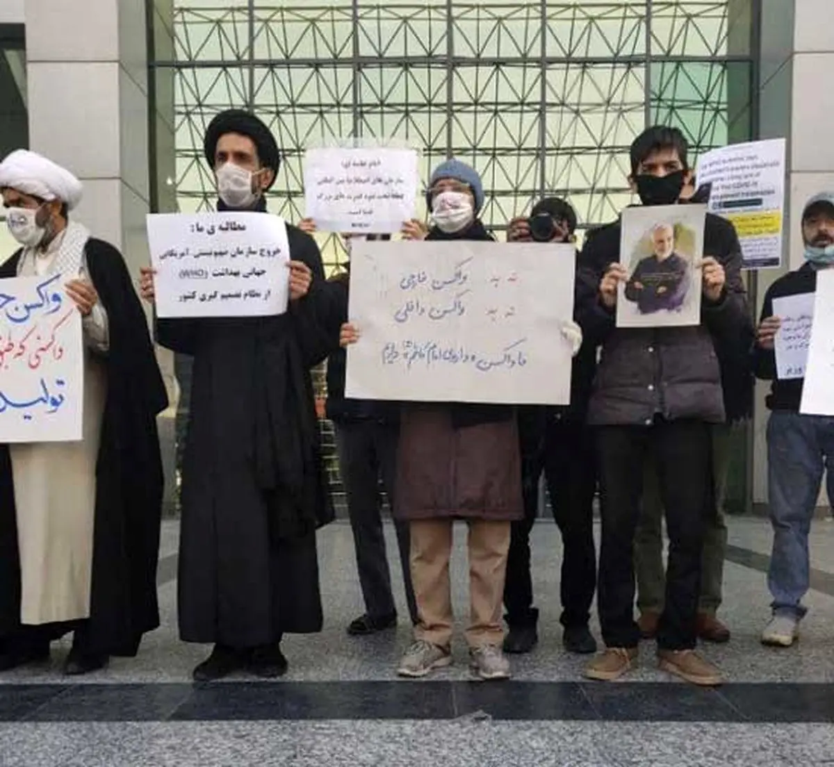 روی پلاکارد یکی از معترضین نوشته بود: «نه به واکسن داخلی، نه به واکسن خارجی! ما خودمان واکسن امام کاظم داریم!».