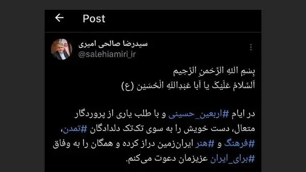 به گزارش رکنا، سید رضا صالحی امیری سیاستمدار و مقام امنیتی سابق که در دولت چهاردهم سمت وزیر میراث فرهنگی، گردشگری و صنایع دستی را بر عهده دارد در اولین پست خود در شبکه اجتماعی ایکس از دلدادگان تمدن، فرهنگ و هنر ایران برای همراهی و همکاری، در نخستین پست خود دعوت کرد.