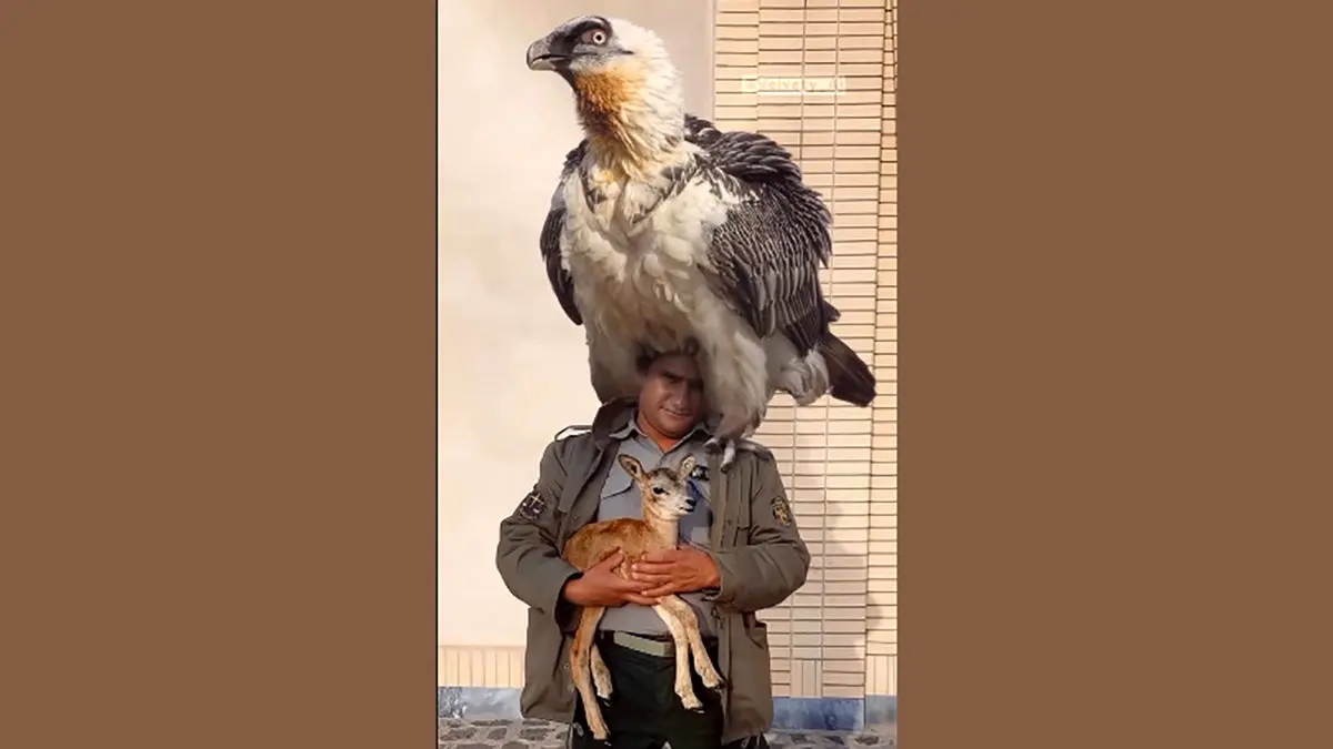 فیلم کم نظیر از همای سعادت غول پیکر بر روی دوش محیط بان ایرانی / بچه آهو هم در آغوشش هست