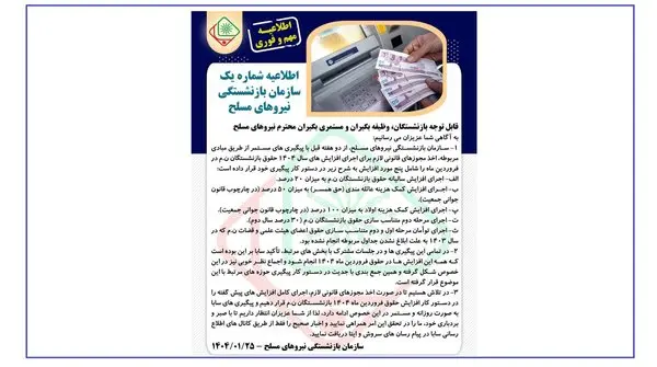خبرهای خوش برای بازنشستگان لشکری / تصویب همسان سازی حقوق ۳۰ درصد سال دوم و اجرای آن از فروردین ماه