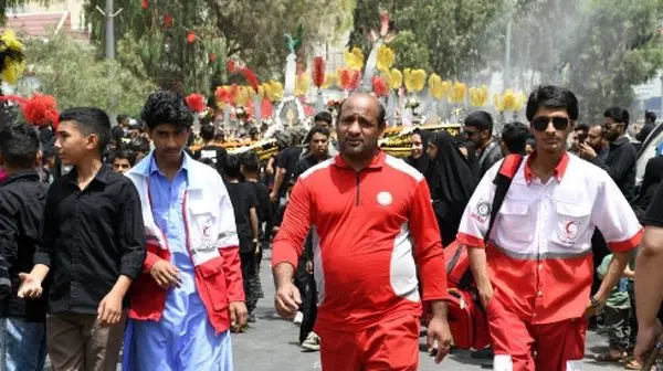 در جریان این مراسم مذهبی، تیمهای امدادی هلالاحمر با برنامهریزی دقیق در نقاط مهم و پررفتوآمد و همچنین مسیرهای برگزاری دستههای عزاداری، خدمات امدادی و درمانی اولیه را به عزاداران حسینی از جمله سینهزنان و زنجیرزنان ارائه کردند.