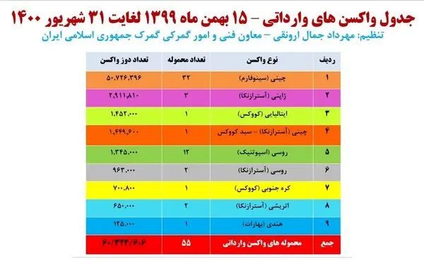 به گزارش رکنا، مهرداد جمال ارونقی، معاون فنی و امور گمرکی گمرک جمهوری اسلامی ایران آمار واکسن های وارداتی به کشور را تا به امروز اعلام کرد. بر اساس جداول مربوطه که از سوی وی تنظیم و در پی آمده از تاریخ 15 بهمن سال 1399 لغایت (امروز) 31 شهریور ماه 1400 بیش از 60 میلیون دوز انواع واکسن وارد شده است که بیش از 50 درصد آن در شهریور 1400 وارد کشور شده است.
