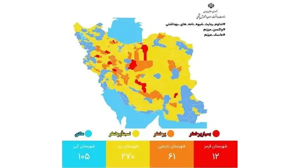 بر این اساس اکنون ۱۲ شهر در وضعیت قرمز کرونا و ۶۱ شهر در وضعیت نارنجی، ۲۷۰ شهر در وضعیت زرد و ۱۰۵ شهر در وضعیت آبی قرار دارند.