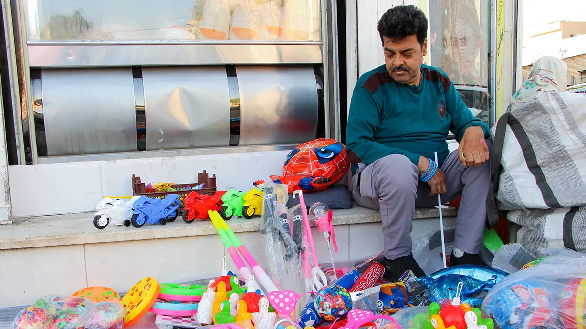 او برای تامین هزینه های زندگی اش، ناچار شده است بادکنک فروشی کند و برای این کار، به پارک آزادگان مراجعه می کرد ولی مدتی است که شهرداری از او خواسته است تا مجوز تهیه کند و می گوید: «من با این وضعیتم، نمی توانم از پله های اداره بالا و پایین بروم و برای گرفتن مجوز کاغذبازی کنم. برای همین سر کوچه بساط می کنم ولی همین جا هم، باز ماموران شهرداری به سراغم می آیند و می خواهند که بساطم را جمع کنم و بروم.»