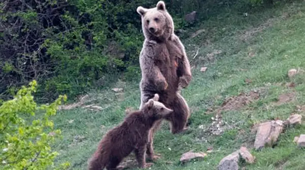 به گزارش رکنا، این خرس مادر احساس خطر کرده‌ و -برای داشتن دید بهتر- روی دو پا ایستاده است. توله هم کاملا هوشیار و منتظر تصمیم مادر است.