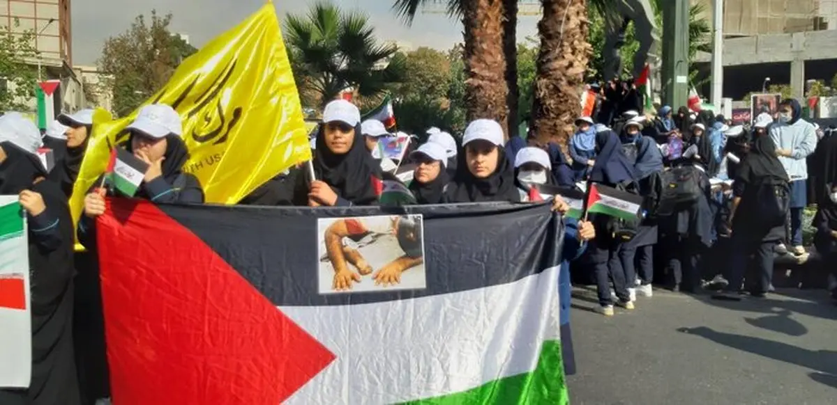 شرکت کنندگان در این تجمع دانش آموزی پرچم های ایران و فلسطین و پلاکارد هایی با مضمون «مرگ بر اسرائیل» در دست داشتند.