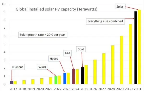 وی افزود: انرژی خورشیدی در سال 2017 از هسته ای عبور کرد. در سال 2022 از بادی هم رد شد. در سال 2023 از آبی هم گذشت. در سال 2024 از گاز عبور می کند.در سال 2025 از ذغال سنگ هم می گذرد.مهمتر از همه اینکه در سال 2031 به تنهایی از ترکیب برق تولیدی همه منابع دیگر بیشتر خواهد شد.