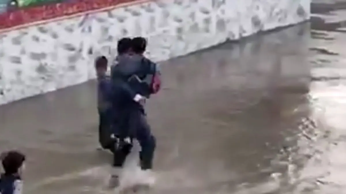 رکنا: اقدام زیبا و قابل تقدیر معلم فدکار مشهدی که دانش آموزان را در آبگرفتگی اخیر مشهد، در آغوش می گرفت و به والدینشان تحویل می داد.