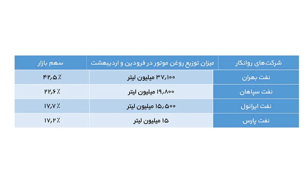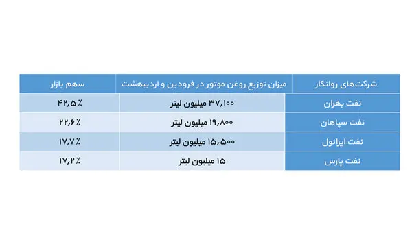 رکنا: آمارها نشان می دهد شرکت نفت بهران فروردین و اردیبهشت ماه سال 1403 نسبت به سال گذشته در تولید و توزیع روغن موتور رکوردشکنی کرده و سهم خود را در بازار روانکارهای خودرویی نزدیک به 43 درصد رسانده است.