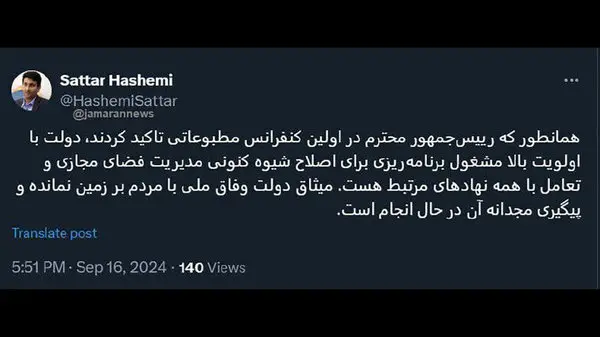 به گزارش رکنا، ستار هاشمی، وزیر ارتباطات پس از نشست خبری رئیس جمهور در توئیتی نوشت: «همانطور که رییس جمهور محترم در اولین کنفرانس مطبوعاتی تاکید کردند دولت با اولویت بالا مشغول برنامه ریزی برای اصلاح شیوه کنونی مدیریت فضای مجازی و تعامل با همه نهادهای مرتبط هست. میثاق دولت وفاق ملی با مردم بر زمین نمانده و پیگیری مجدانه آن در حال انجام است. »