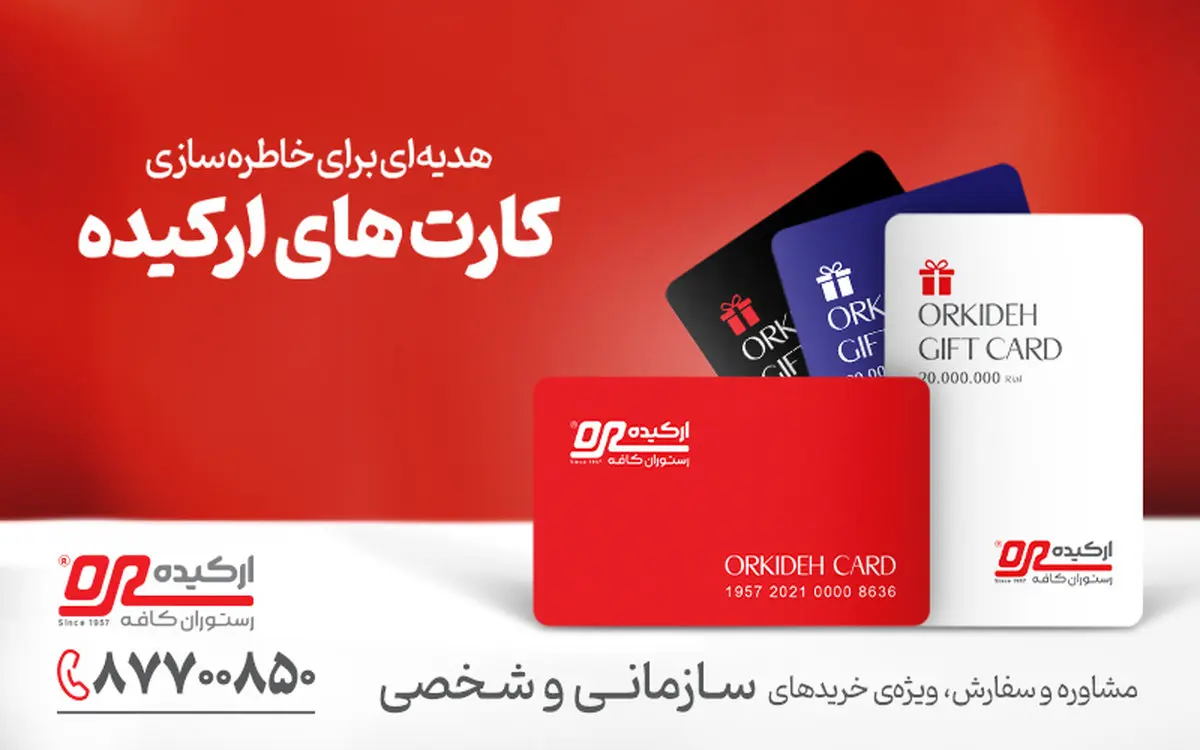 مجموعه رستوران‌کافه‌های ارکیده با توجه به یکی از لذت‌های همیشگی انسان‌ها، یعنی چشیدن غذاهای باکیفیت و خوش‌عطر و طعم، کارت‌های ارکیده را با طراحی بسیار شکیل و زیبا و قابلیت‌های مختلف تدارک دیده تا کار شما برای انتخاب هدیه به مناسبت‌های مختلف را راحت‌تر کند.