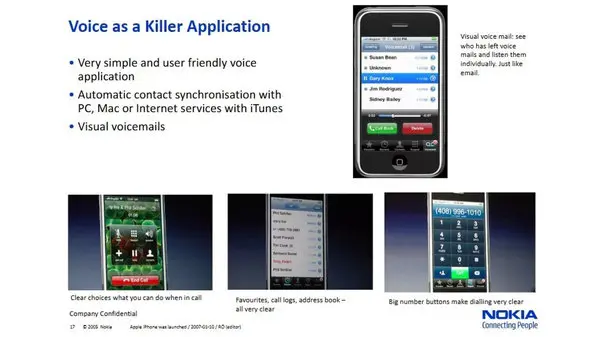 در بخشی از این اسلایدها، به قابلیتهای صوتی آیفون بهعنوان ویژگی کاربردی و مهم اشاره شده است. نوکیا میگوید استفاده از صدا در این گوشی بسیار ساده و کاربرپسند است و بهراحتی میتوان اطلاعات موبایل را با پیسی، مک و سرویسهای اینترنتی به اشتراک گذاشت. نوکیا همچنین به همکاری اپل با اپراتور Cingular اشاره کرده و تأکید داشته آنها هم باید با سایر اپراتورها، مثل T-Mobile، برای رقابت بهتر در بازار همکاری کنند.