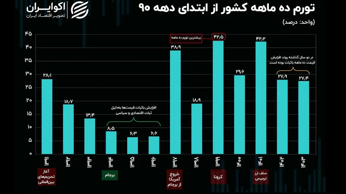 روند باثبات تورم ده ماهه تا سال ۹۶ ادامه داشت، ولی با خروج ترامپ از توافقنامه برجام در ابتدای سال ۹۷ و تشدید تحریمها، سطح عمومی قیمتها در ده ماه ۳۸.۹ درصد افزایش یافته است. پس از این شوک منفی به اقتصاد، تورم ده ماهه در سال ۹۸ تا حدودی کاهش یافته و به ۱۸.۹ درصد رسیده است.