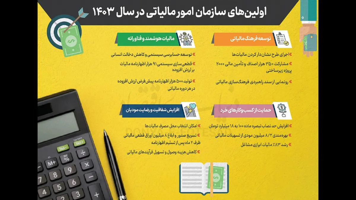 سازمان امور مالیاتی کشور ضمن انجام تکلیف قانونی خود برای تامین درآمدهای مالیاتی پیشبینی شده، در تلاش است با حرکت به سمت یک نظام مالیاتی هوشمند و دادهمحور ضمن کاهش هزینه وصول مالیات، گامهای موثری برای تسهیل امور مؤدیان مالیاتی و ارتقای رویکرد خدمترسانی خود بردارد. این سازمان با رویکرد فوق، گامهای ارزشمندی را برای اولین بار در سال ۱۴۰۳ برداشته و دستاوردهای قابلتوجهی را در بخشهای توسعه فرهنگ مالیاتی، استفاده از تکنولوژیهای جدید در مالیاتستانی، حمایت از کسب و کارهای خرد و توسعه فرهنگ مالیاتی داشته است.