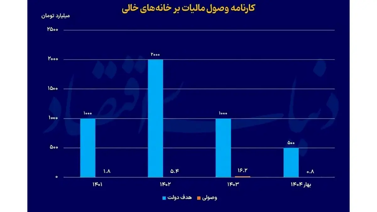 طی این سالها عوامل سازمان مالیاتی نیز به نوعی، «منتقد شیوه پیشبینی شده برای مالیات بر خانههای خالی بودند.» نکته معنادارتر برای سال 1404 است. دولت در بودجه 1404، رقم درآمدی 2000میلیارد تومان پیشبینی شده در بودجه 1402 را به 500میلیارد تومان کاهش داد چون احتمالا خودش به «ناکارآمدی این مالیات در تامین مالی بودجه» واقف شده است. سال گذشته 1.6میلیارد تومان از این محل حاصل شد و طی 3 ماهه اول امسال نیز وصولی، 800میلیون تومان بوده است.
