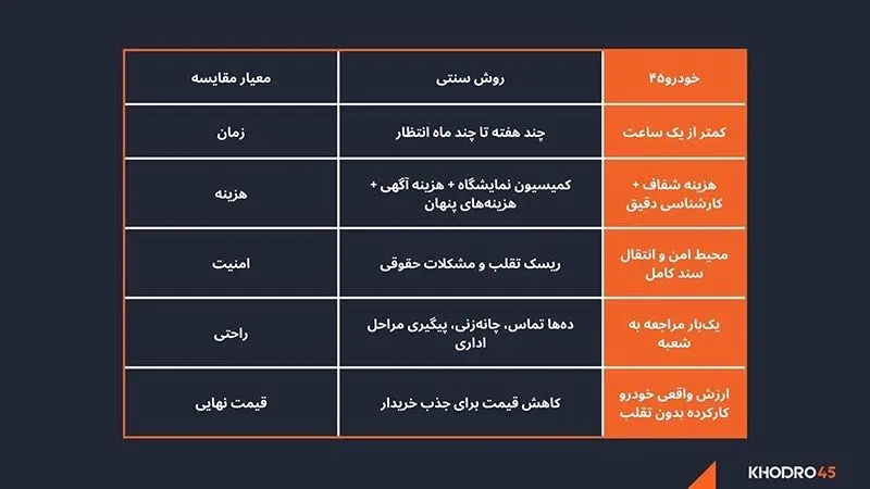 در روش سنتی خودروی شما باید از دست چند واسطه بگذرد تا به خریدار نهایی برسد. هر واسطه سهم خودش را می‌گیرد و در نهایت شما کمترین سود را می‌برید. خودرو۴۵ این زنجیره طولانی را کوتاه کرده و شما را مستقیم به خریدار نهایی وصل می‌کند.