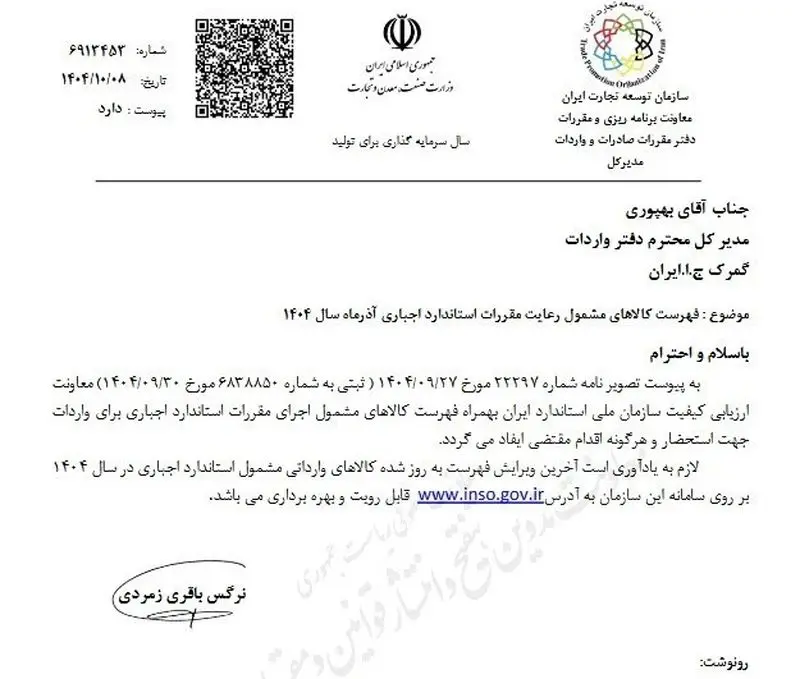 رکنا اقتصادی: سازمان توسعه تجارت ایران با صدور بخشنامه ای جدید در تاریخ 8 دی ماه 1404، فهرست کالاهای مشمول استاندارد اجباری را اعلام کرد؛ رعایت این استانداردها برای واردات و صادرات الزامی بوده و تخلف از مقررات موجب ممانعت از ترخیص کالا خواهد شد.