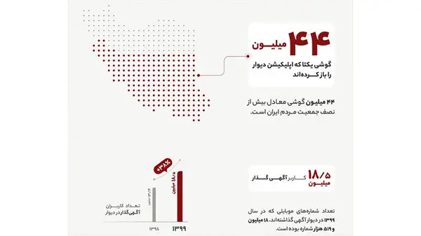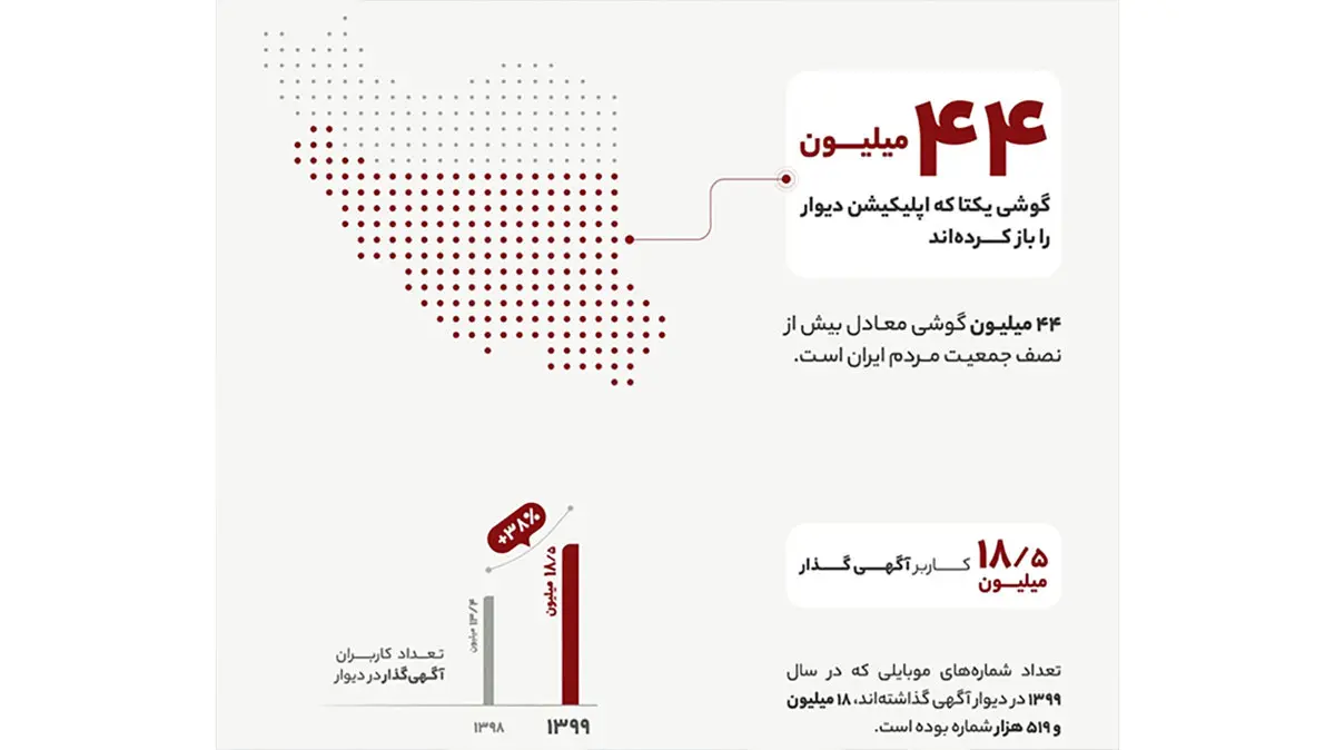 بنا به گزارش سالیانه اپلیکیشن دیوار در سال ۹۹ که به تازگی منتشر شده، در سالی که گذشت ۴۴ میلیون گوشی یکتا، معادل بیش از نصف جمعیت کشور، اپلیکیشن دیوار را باز کردهاند و هر خانوار ایرانی به طور متوسط ۵ آگهی روی سایت دیوار منتشر کرده است.