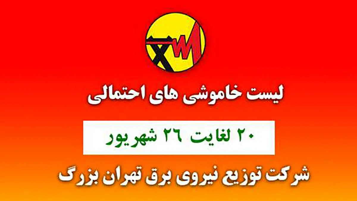 جدول خاموشی های احتمالی برق شهر تهران از تاریخ 20 لغایت 26 شهریور اینجا کلیک کنید