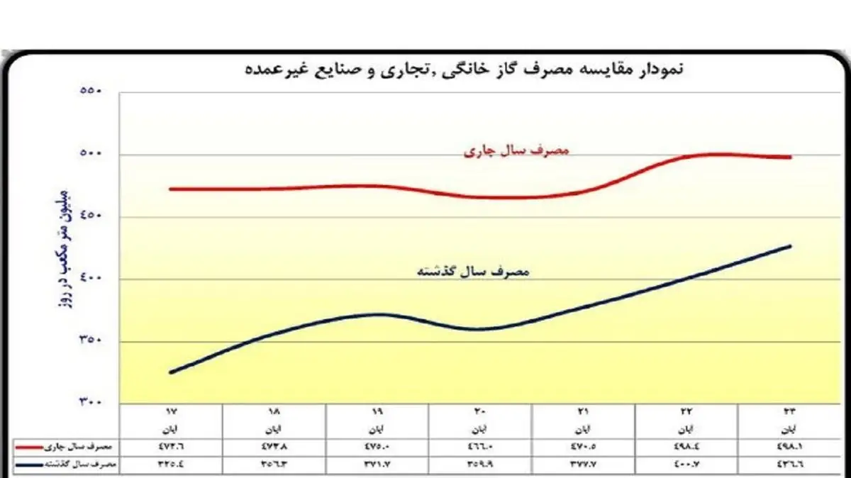 اکنون نیز شرکت ملی گاز ایران نمودار مقایسهای از مصرف گاز طبیعی در هفته اخیر منتشر کرده که نشان میدهد مصرف روزانه به مرز ۵۰۰ میلیون مترمکعب نزدیک شده است درحالی که این مقدار در زمستان پارسال و زمان اوج مصرف به روزانه ۵۶۵ میلیون مترمکعب رسیده بود.