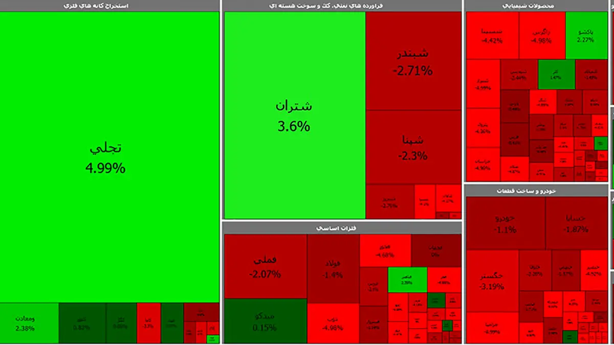 نمادهای تجلی و شتران بیشترین اثر مثبت و نمادهای زاگرس، فرابورس و شاوان بیشترین اثر منفی را بر شاخص کل بورس گذاشتند.