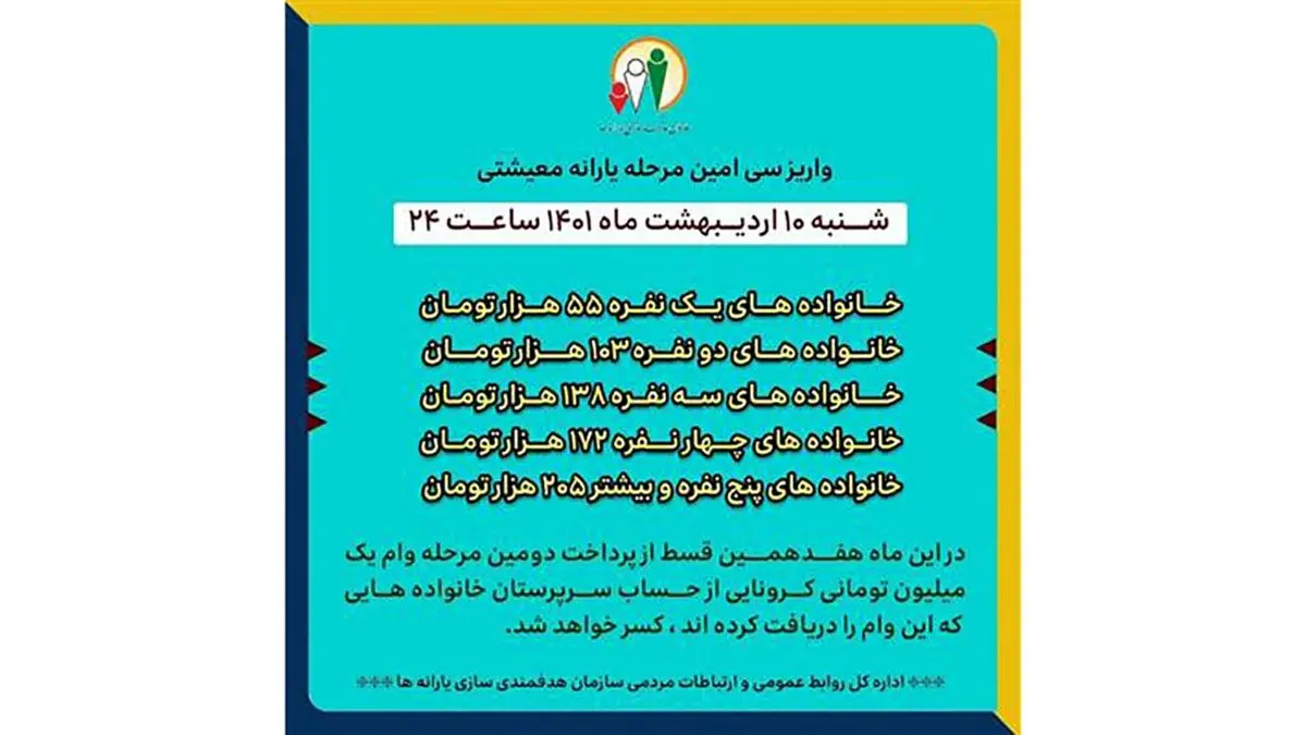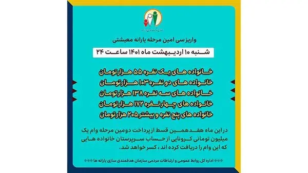 در این مرحله از واریز نیز به خانواده های یک نفره 55 هزار تومان، خانواده های دو نفره 103 هزار تومان، خانواده های سه نفره 138 هزار تومان، خانواده های چهار نفره 172هزار تومان و خانواده های پنج نفره و بیشتر 205 هزار تومان پرداخت می شود.
