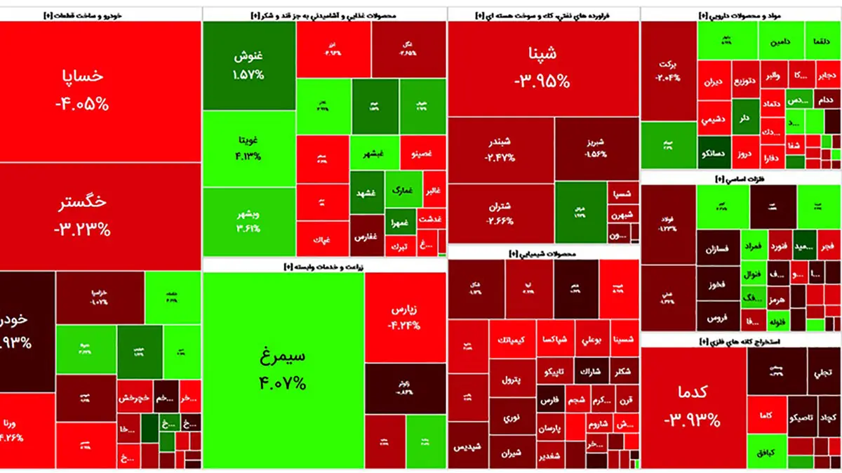 نمادهای شپنا، فملی، شبندر، فولاد و شتران بیشترین اثر منفی را بر بورس امروز گذاشتند. نمادهای شرکت های مواد غذایی بیشترین اثر منفی و خودروسازان بیشترین اثر منفی را بر شاخص بورس امروز گذاشتند.