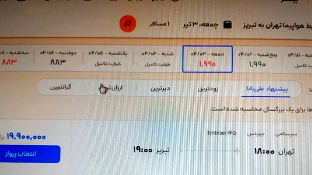 به گزارش رکنا ، امروز قیمت بلیط پرواز تهران- تبریز برای دوم و سوم تیرماه با رقم ۱۹ میلیون و ۹۹۰ هزار ریال رکورد چند روزه را شکست و حیرت مسافران این مسیر را دو چندان کرد. هر چند این آمار و ارقام نجوم برای پروازهای ایرلاین هواپیمایی از جمله هواپیمایی آتا حتی بیشتر از این مبالغ، در روزهای گذشته توسط مسافران زمزمه میشد اما امروز در پی تحقیقات میدانی خبرنگار فارس مشخص شد قیمتهای سربه فلک کشیده این شرکت هواپیمایی چندی برابر پرواز سایر ایرلاینها حتی در مسیرهای دورتر در این روز است.