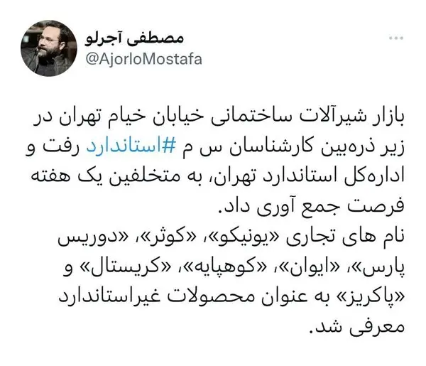 نام های تجاری "یونیکو"، "کوثر" ، "دوریس پارس"، "ایوان" ، "کوهپایه" ، "کریستال" و "پاکریز" به عنوان محصولات غیر استاندارد معرفی شد.