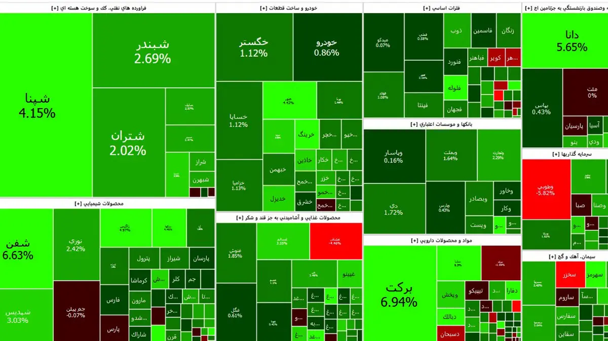 نمادهای شپنا، شتران، شبندر، شپدیس، شستا و شفن بیشترین اثر مثبت را بر بورس گذاشتند.